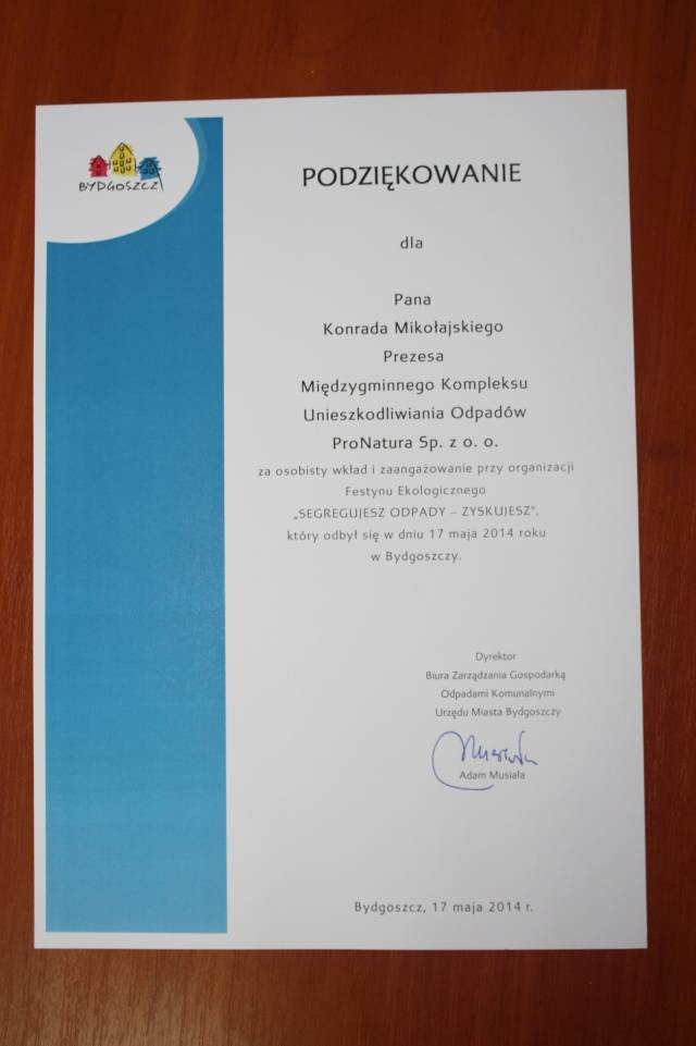 17 maja 2014 roku na bydgoskiej Wyspie Młyńskiej odbył się Festyn Ekologiczny „Segregujesz Odpady – Zyskujesz”, podczas którego ProNatura zaprezentowała swój nowoczesny sprzęt wywozowy.