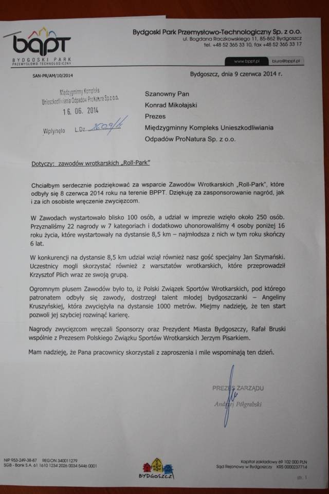 W dniu 8 czerwca 2014 roku odbył się wyścig wrotkarski „Roll-Park” organizowany przez Bydgoski Park Przemysłowo-Technologiczny. ProNatura włączyła się w akcję poprzez ufundowanie nagród dla zwycięzców.
